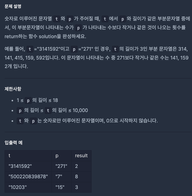 p의 count씩 t를 순서대로 쪼개서 나온 숫자가 만약 p보다 작거나 같은 숫자의 갯수를 반환하는 문제이다