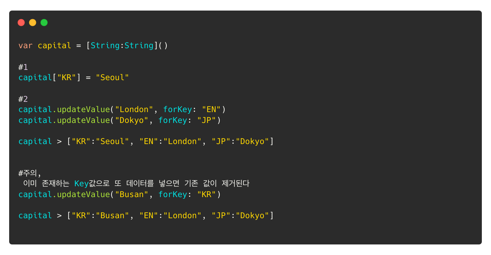 - 키를 중복해서 입력하면 기존에 있던 데이터가 제거된다(덮어씌워진다)