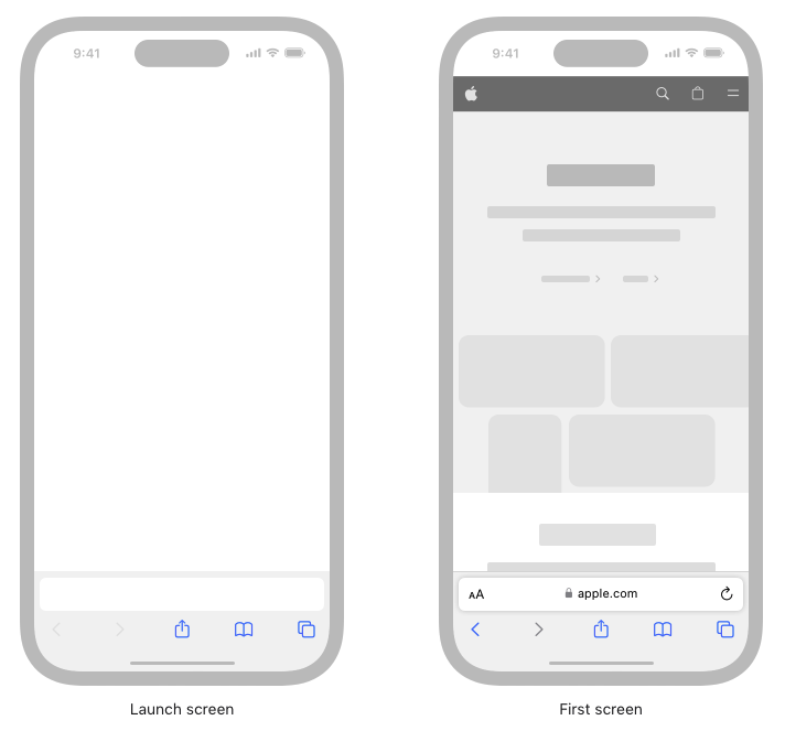 시작 화면은 브랜딩을 위한 기회가 아닙니다. 스플래시 화면이나 '정보' 창처럼 보이는 화면을 만들지 말고 앱 첫 화면의 고정된 부분이 아니라면 로고나 기타 브랜딩 요소를 포함하지 마세요. 게임이나 기타 몰입형 앱에서 첫 화면으로 전환하기 전에 단색으로 표시되는 경우 해당 단색만 표시하는 시작 화면을 만드세요.