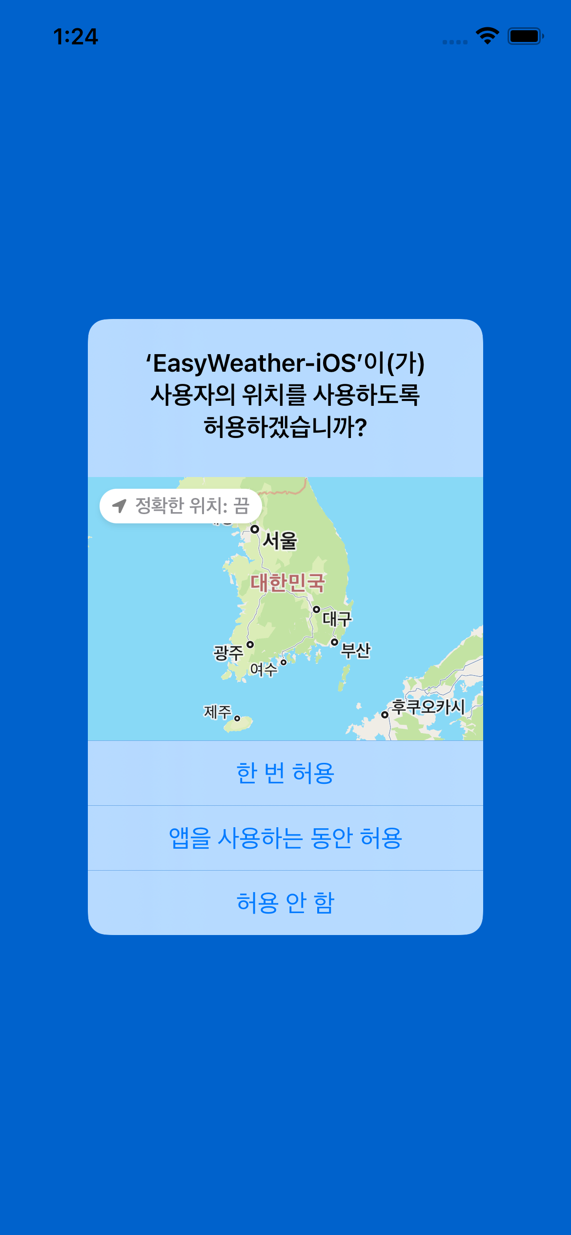 하단의 코드는 위치 서비스 권한 요청 ViewController입니다