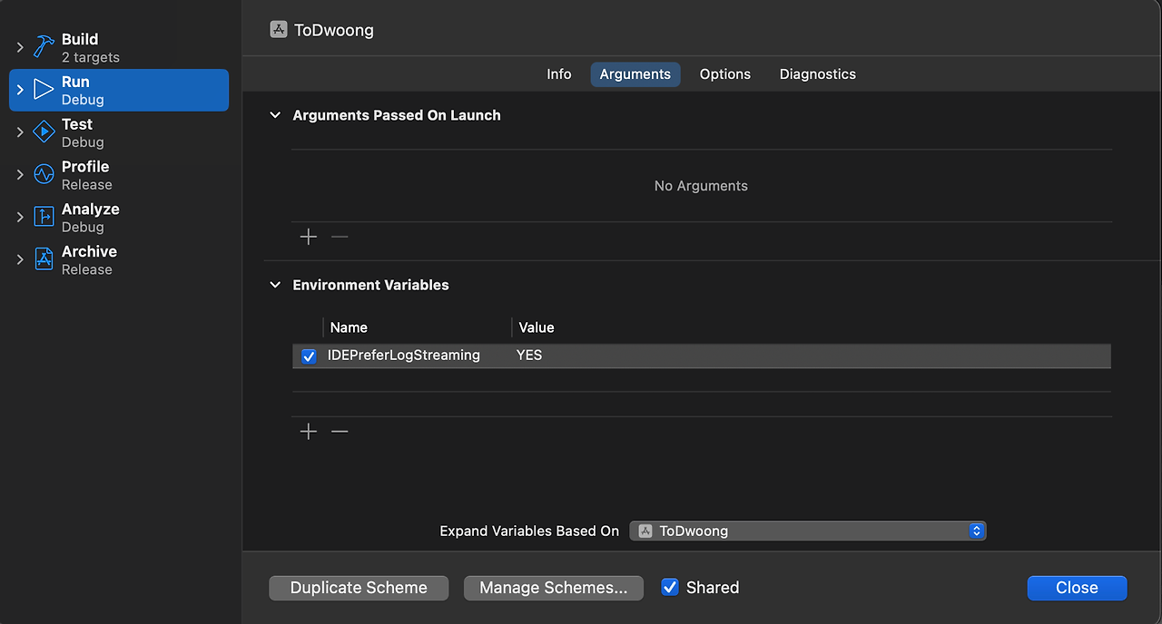 에러 메세지에 적힌대로 스킴 환경 변수에 IDEPreferLogStreaming=YES를 설정해줍니다