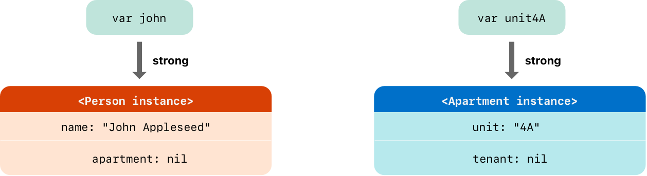 - john과 unit4A는 각각 Person과 Apartment 클래스 인스턴스에 strong 참조를 한다. RC +1