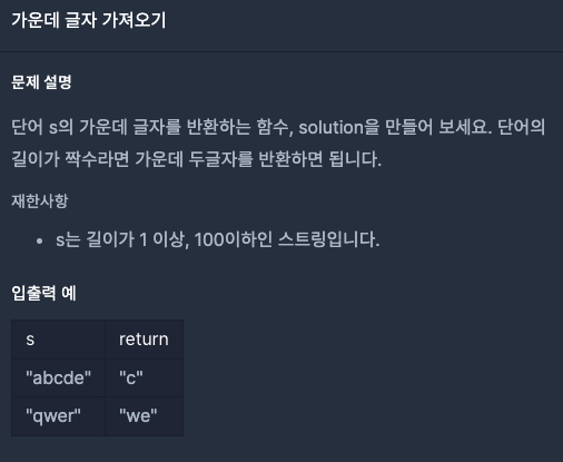 - s의 길이를 사용해서 홀수일 경우, 짝수일 경우 각각 가운데에 해당하는 index를 구함