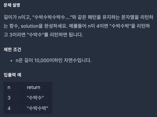 길이 n이 주어졌을 때 "수박수박수..." 패턴을 유지하며 n만큼 문자열을 반환하는 문제이다.