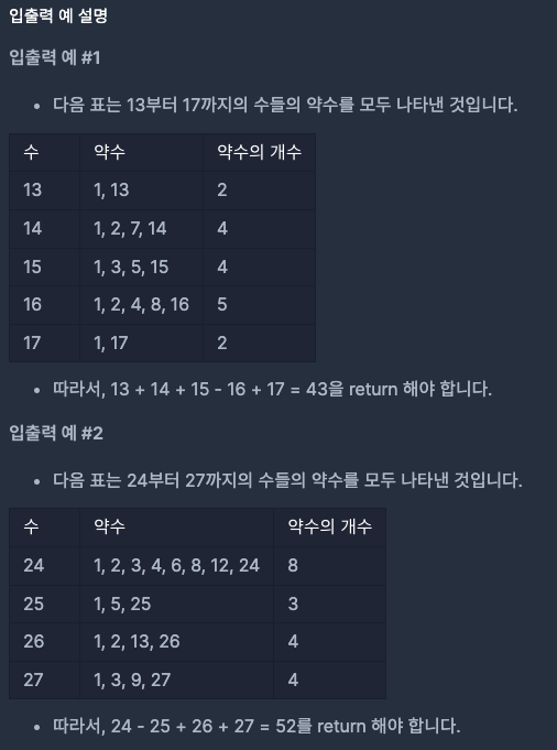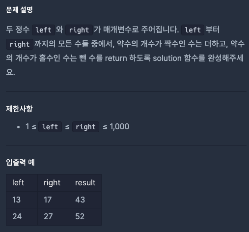 두 정수 사이 범위에서 약수가 짝수라면 + 홀수라면 -를 한 값을 반환하는 문제이다.