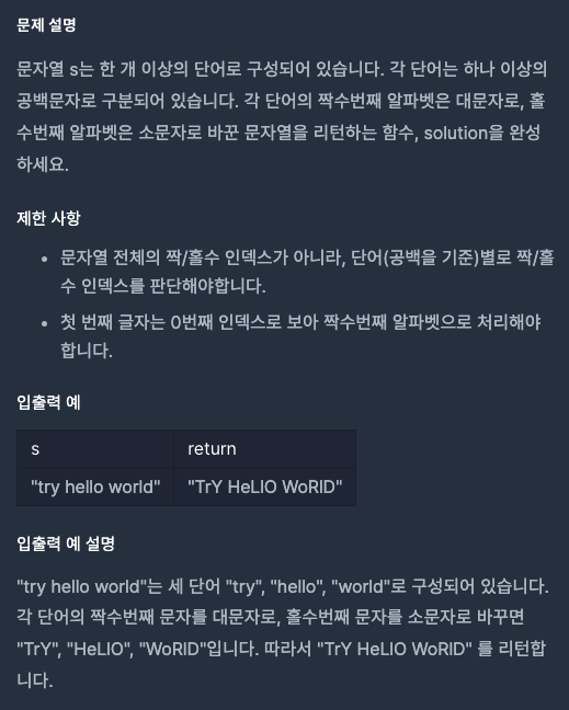받아온 문자별을 공백 기준 단어별로 짝수라면 대문자, 홀수라면 소문자로 바꿔준다.