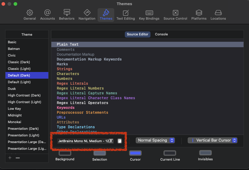 xcode -> Settings -> Themes 로 들어가면 폰트를 바로 바꿀 수 있다.